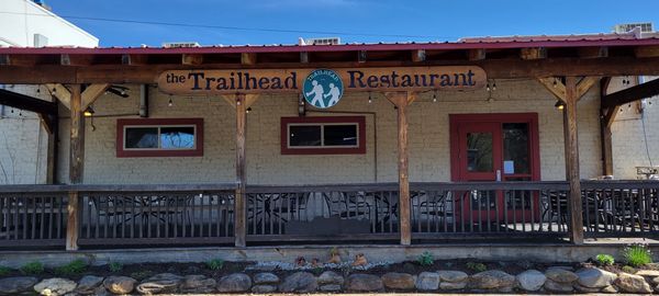 Trailhead Restaurant transformed a crabgrass and weed area beside their deck into an inviting garden area. Succulents and sedum that will survive the heat from the sun and the black top parking lot were planted. For the railing they added a black wooden mountain range on spindles and a rock trail below.